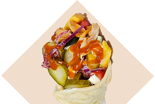 Shavings of lightly spiced chicken topped with our home-made Greek salad, sumac infused red onions & fries. Includes sourdough flatbread and home-made Tzatziki.