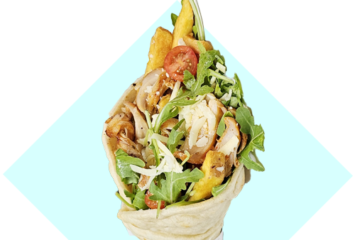 Shavings of lightly spiced chicken on a bed of peppery rocket, tomatoes, grated Mozzarella and Cheddar & fries. Includes sourdough flatbread and creamy garlic mayo.