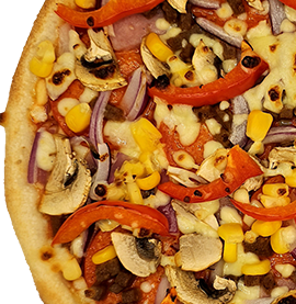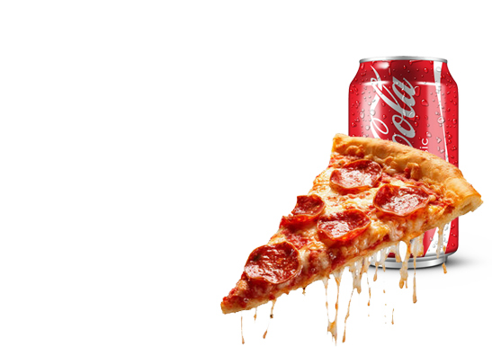 Small pizza with 2 toppings & a can of drink.