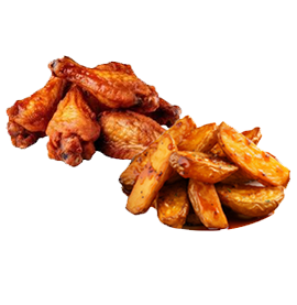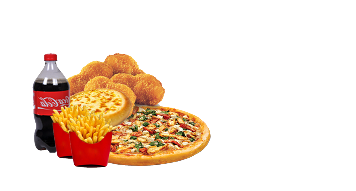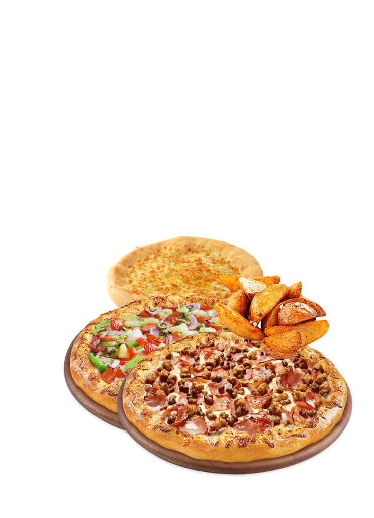1 Large pizza, 1 medium pizza, premium garlic bread with cheese & potato wedges.